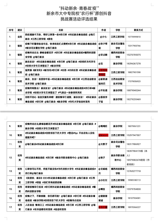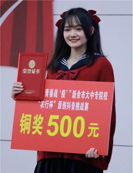 十月,一场突如其来的疫情,让新余突然静了下来,但抵挡不住全民众志成城、抗击疫情的磅礴力量。为配合全市疫情防控工作,充分展示大中专院校师生的精神面貌,让寝室外静下来,寝室内动起来,更好地活跃校园文化生活,中共新余市委宣传部、中共新余市委网信办、新余市教育局决定联合举办了“抖动新余·青春战‘疫’”新余市大中专院校“农行杯”原创抖音挑战赛,公司积极动员同学们参加并取得了优异的成绩: