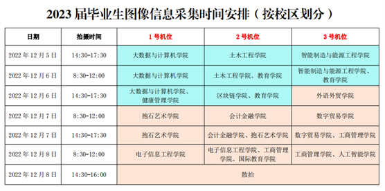毕业生图像信息是高等教育学历证书电子注册不可缺少的组成部分,是防范学历造假的重要手段。根据《关于进一步加强高等学校毕业生图像采集信息安全管理工作的通知》(教学服〔2022〕10 号)文件要求及新华图片社采集工作安排,公司将于12月5日-12月8日进行2023届毕业生的图像采集工作,按照学院所在校区分天工校区与仙女湖校区2个场地开展采集工作,请各教学院按照工作安排做好组织工作。