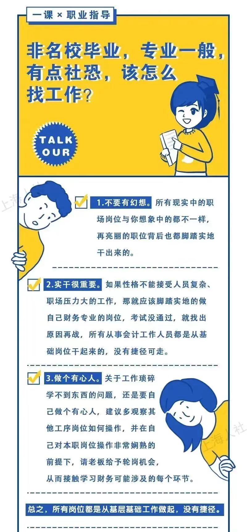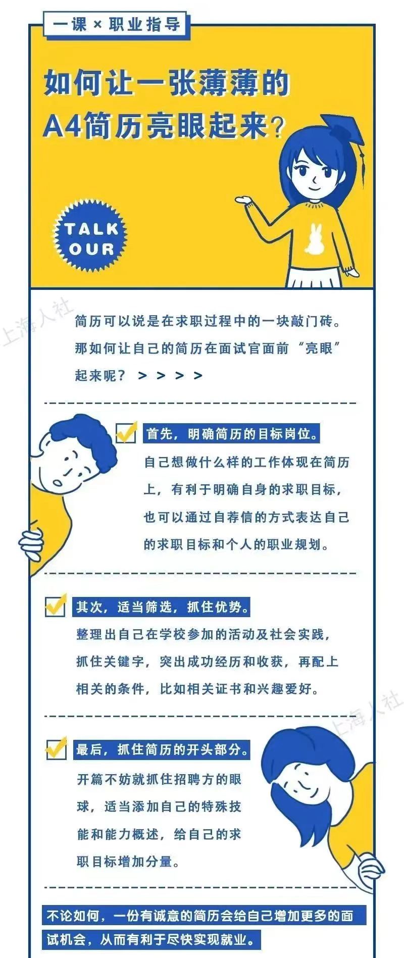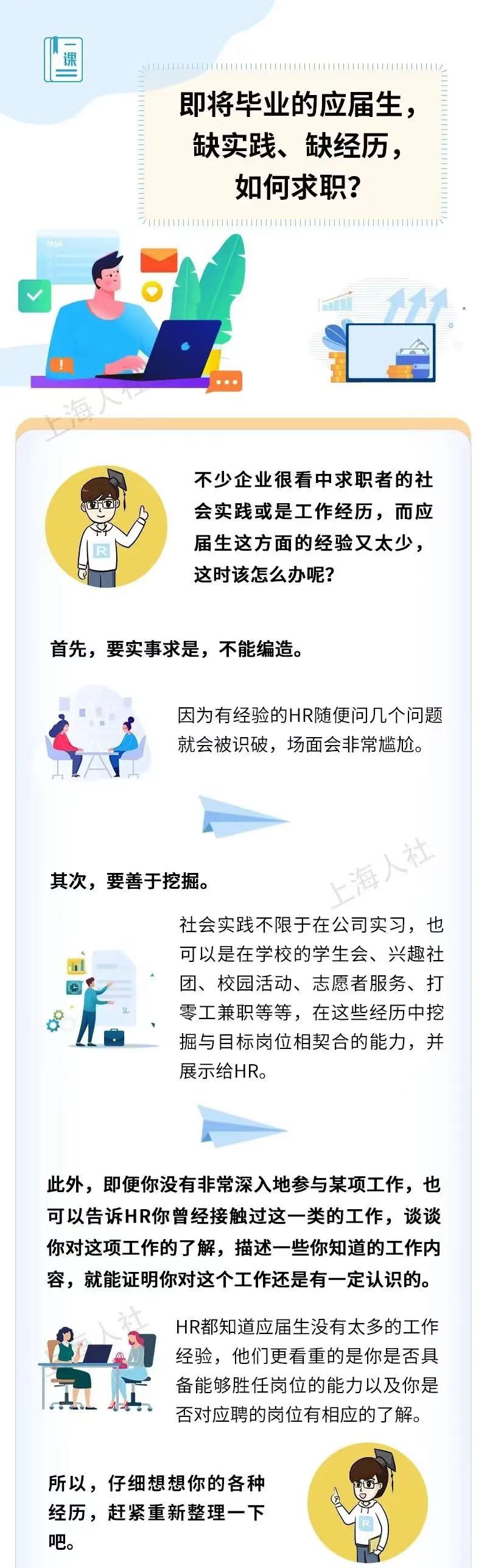 即将毕业的应届生,缺实践、缺经历,如何求职?第一份工作到底该如何选择?如何让一张薄薄的A4简历亮眼起来?在踏入职场前,要做点什么准备?你有遇到这些问题吗?快来看看下面的求职攻略↓↓↓