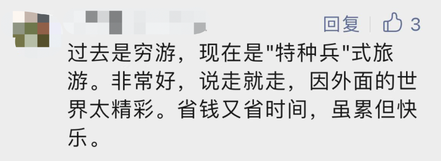其实,很多人选择“特种兵式旅游”,选择的是一种在路上的生活状态,也是一种“读万卷书,行万里路”的生活方式。这本身就是发现美好、热爱生命的体现。