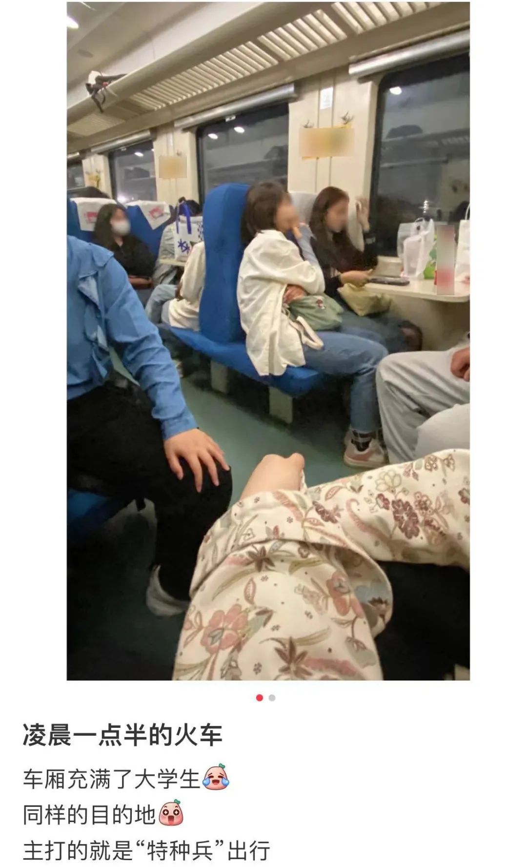 有网友分享了从郑州去西安火车上的景象:夜晚的硬座车厢几乎全是周末旅游的老员工。
