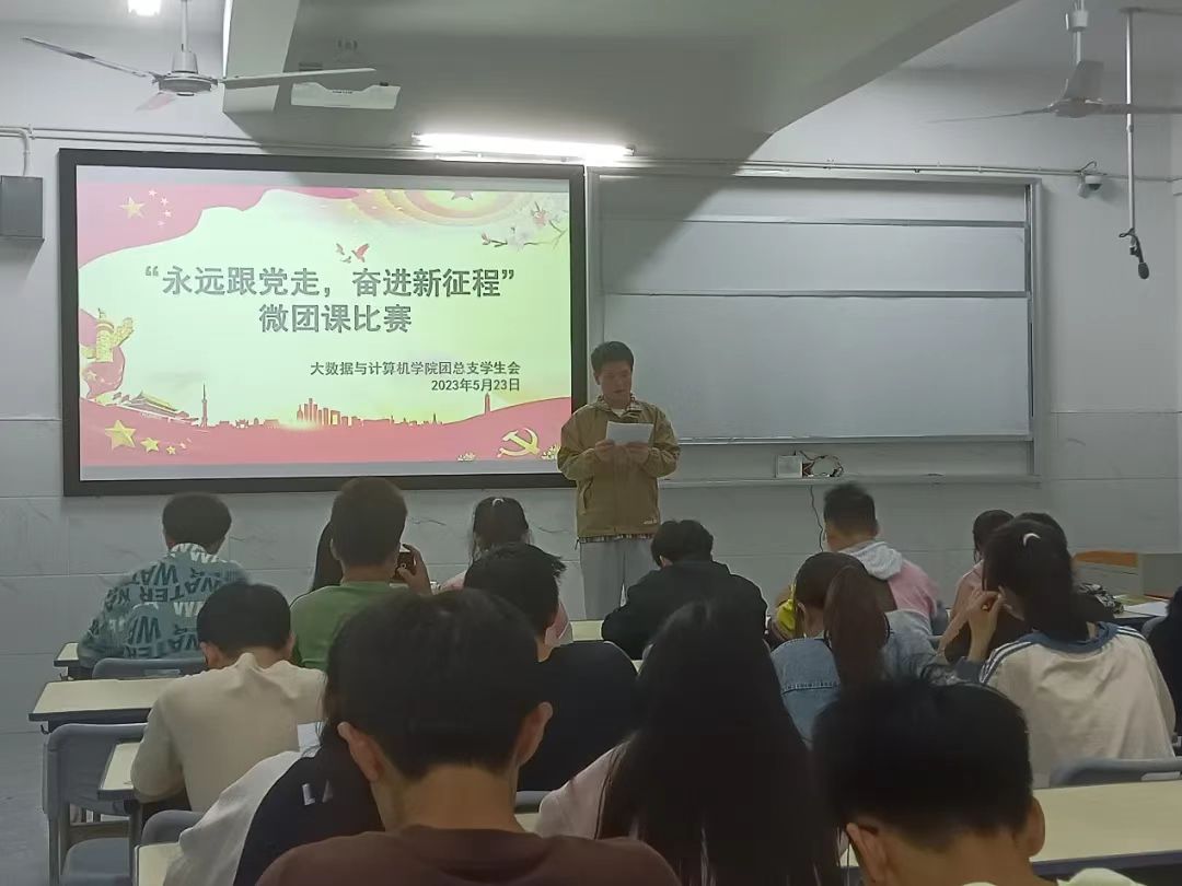 为深入学习贯彻党的二十大精神和习近平新时代中国特色社会主义思想,引导广大青年坚定理想信念,坚守使命初心。大数据与计算机学院于5月23日在c206举行“永远跟党走,奋进新征程”微团课比赛。本次活动由团总支员工会主席郭冲主持,各班同学积极参加。