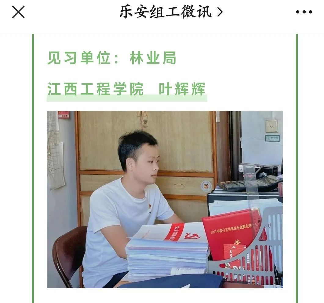 2021年叶辉辉报名参加了由乐安县组织部举办的“红色传承,学子归乡”政务实践活动,被分配到招携镇党政办,在实践期间跟随领导下乡调研,收集各个村的基本数据,了解农业产区示范区的先进做法,下到基层征求村民意见建议,并结合个人实践向县委组织部提交了家乡发展,乡村振兴的建议方案。2022年他再次报名参加了由抚州市委组织部举办的“才子归巢”实践活动,并被分配到乐安县林业局党组办公室成为一名党建干事,通过在办公室的实践了解了机关具体工作的一般流程,也对今后的职业规划有了更加清晰的认识。