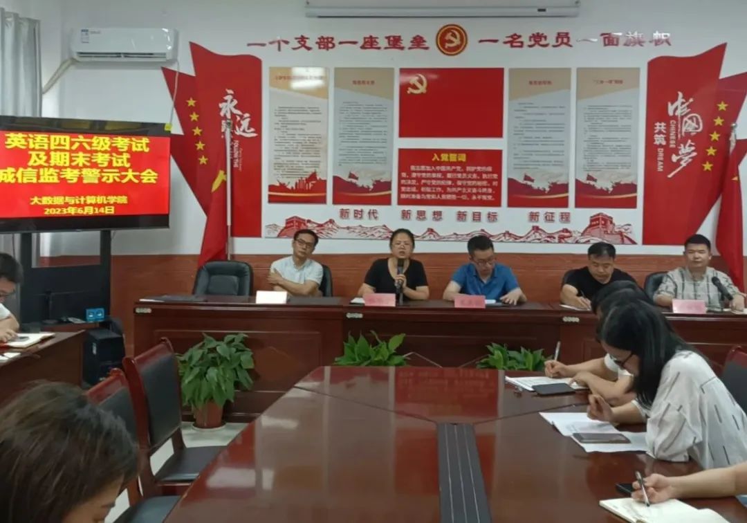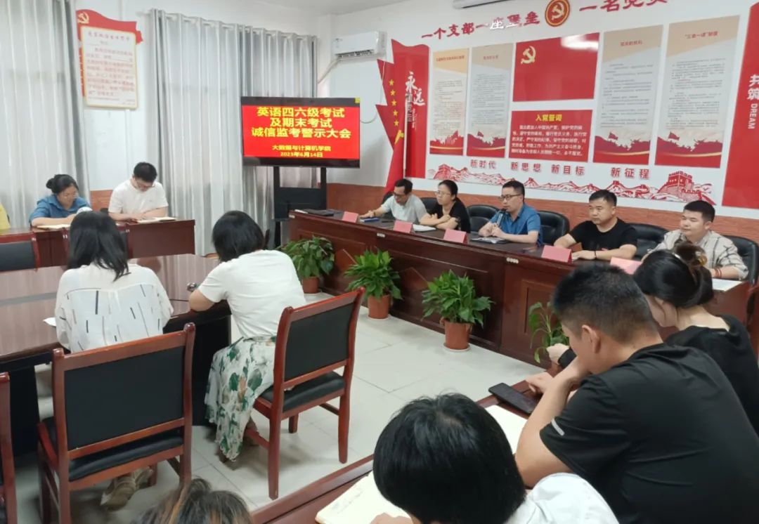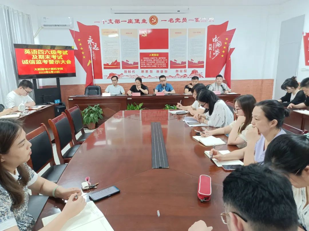 为做好本学期全国英语四六级和期末考试监考工作,进一步严肃考风考纪。大数据与计算机学院于6月14日在B504会议室召开“英语四六级考试及期末考试诚信监考警示大会”,此次会议由学院办公室主任黄竹明主持,全体教师参加。