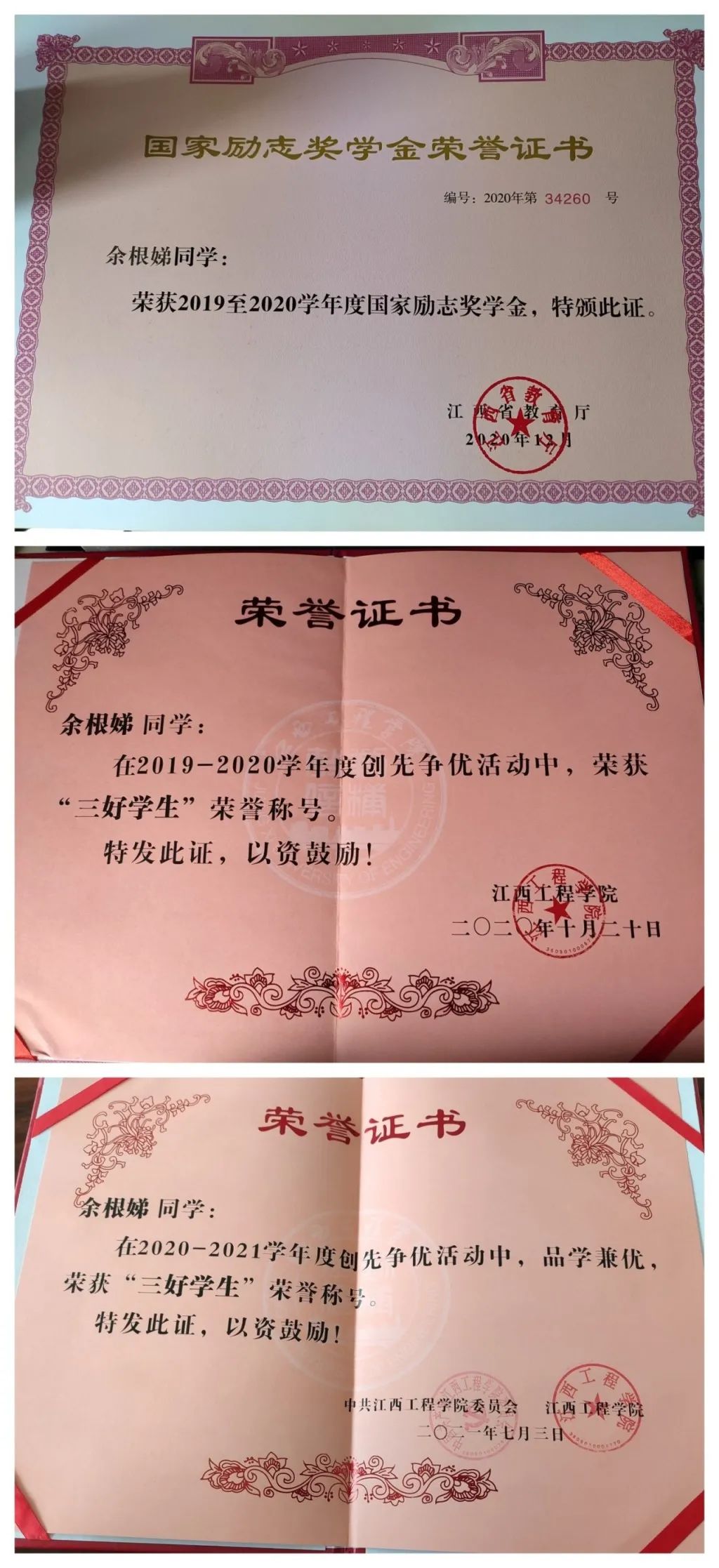 在校期间获得2020年&2021年校三好员工证书,获得省教育厅2019至2020学年度国家励志奖学金,获得第四届计算机技能应用大赛优秀奖。在大四创业培训(实训)中评为优秀学员并考取证书。身为江工学子,我感恩栽培;身为大数据学子,我倍感自豪。