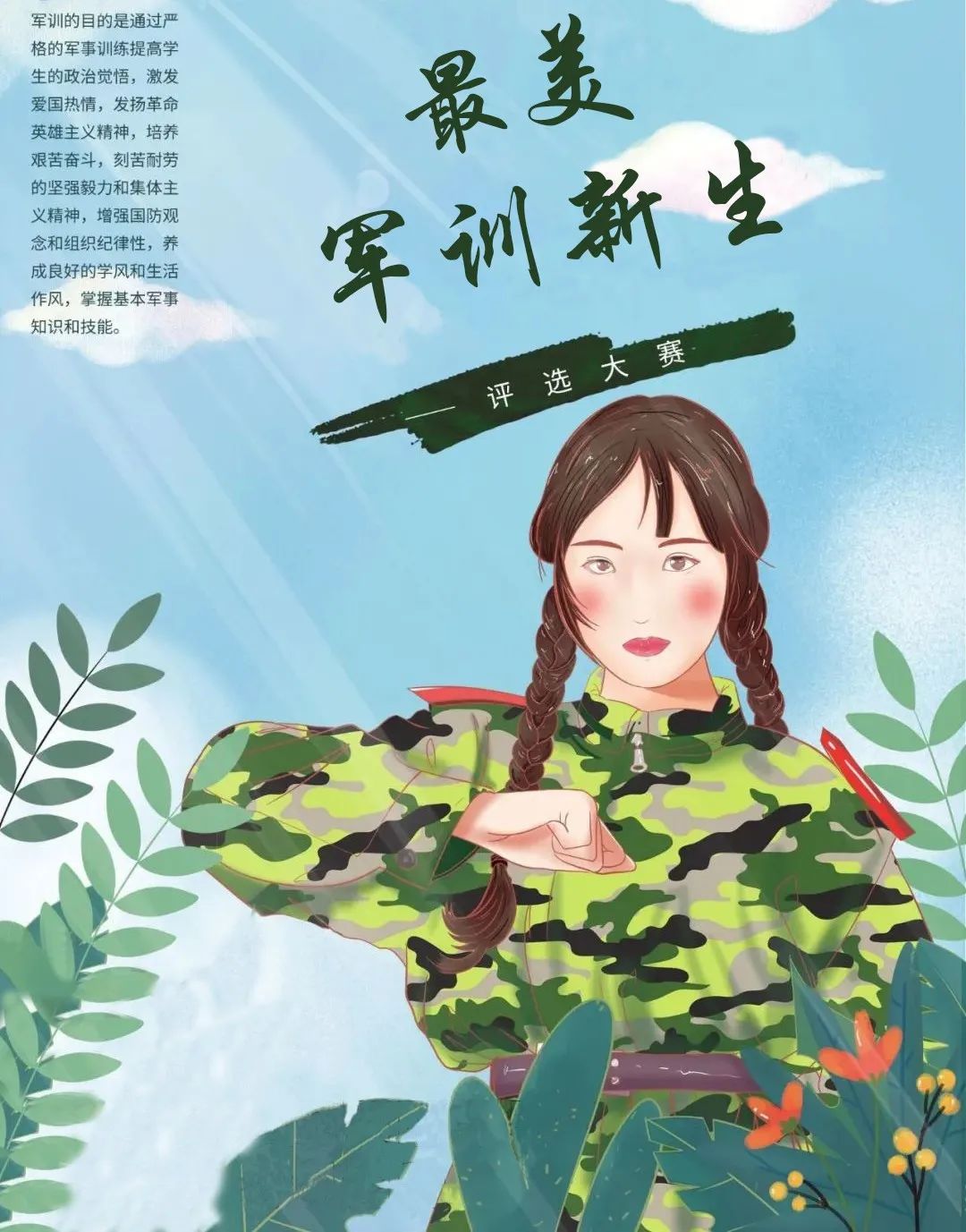 为做好思想引领、弘扬公司学子军训期间优良的精神风貌,记录公司学子军训生活的点点滴滴,彰显23级新生朝气蓬勃的青春风采,促进公司新生德智体美全面发展,大数据与计算机新媒体运营中心特别举办本次“最美军训新生”评选大赛,希望同学们积极报名参加,勇于展示个人军训时期的飒爽英姿。