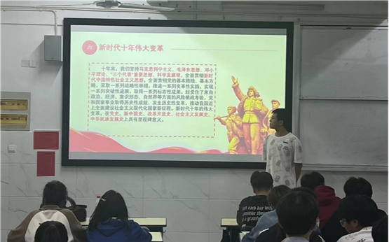10月16日晚自习,团总支书记林稳来到2023级软件技术专科3班,带领全班同学深入学习习近平新时代中国特色社会主义思想的核心要义,明白坚持党的领导是中国特色社会主义的本质特征和内在要求。重点解释了“两个结合”、“六个必须坚持”、“十个明确”、“十四个坚持”与“十三个方面成就”的含义与当代意义,增强了同学们的对新时代党的自豪感与认同感。同时林稳分享了自己对“思想旗帜在生活中的引领作用”理解,以贴近生活,符合实际的方式,表明树立思想旗帜的重要性与必要性。
