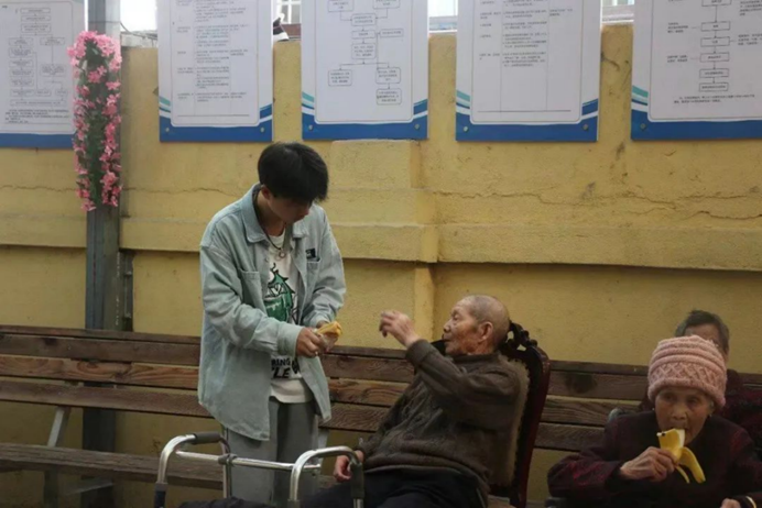 一大早,志愿者们就在学校门口集合,大家都怀着温暖的心准备向众乐养老院出发。到达目的地后,在养老院管理人员带领下进院,在大院里我们看到三五位老人坐着聊天的,在看电视上播放的体操的,在闭目养神休息的……看到我们后,爷爷奶奶们都开始露出笑容,我们也一一和爷爷奶奶们打招呼同时分发我们提前准备好的面包和香蕉。