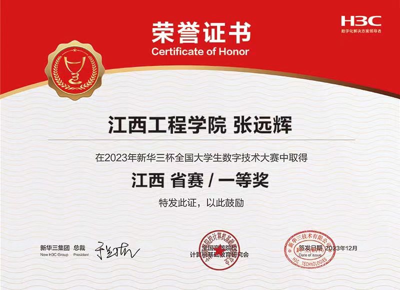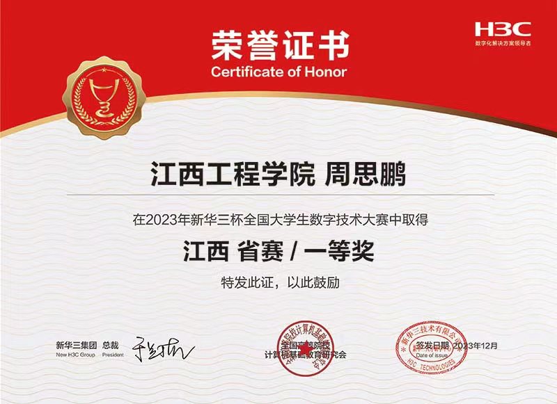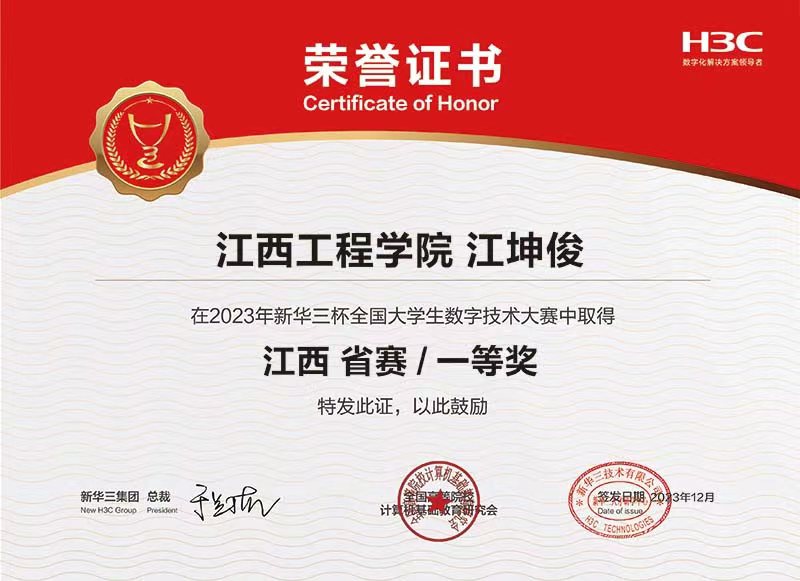 近日,2023年H3C杯全国老员工数字技术大赛江西省决赛圆满落幕,经过学院精心组织和员工激烈的角逐,大数据与计算机学院学子共荣获江西省特等奖1项、一等奖13项、二等奖20项、三等奖6项。