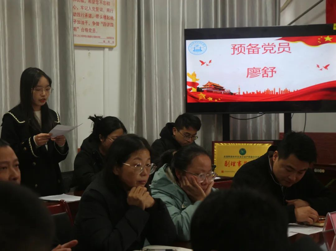 介绍人发言,介绍人胡木兰老师表示,廖舒同学积极参加校园文化、科技创新、社会实践、志愿服务等活动,综合素质较高。勤奋学习,刻苦钻研,成绩优良,无挂科且学期学习成绩、综合测评成绩优秀。认为其已经具备加入中国共产党的条件。林稳老师表示,她积极参与每一期青年大学习。在同学中有较高的信服力并起到先锋模范作用,乐于助人、关心他人,有较好的同学关系基础。同意介绍其随后对廖舒同学转正进行了投票,最后廖舒同学以全票通过顺利转正。