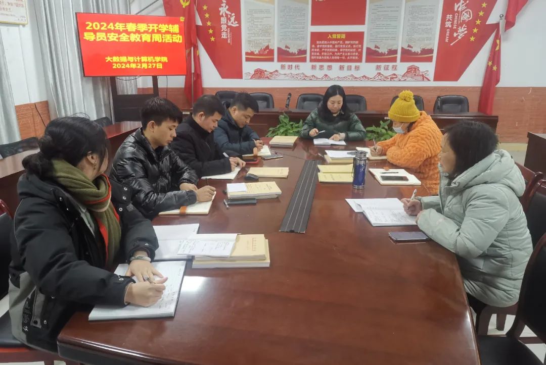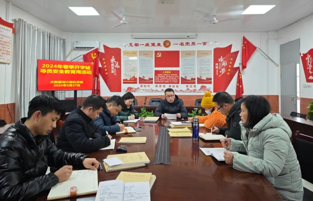 为了强化安全教育,细化安全管理,防控安全风险,关注师生身心健康,进一步增强安全防范意识,提高师生自我保护和应急的能力,上好开学第一课,大数据与计算机学院根据文件的相关要求于2024年2月27日在教学楼B504开展“安全教育周”系列活动的会议。会议由党总支书记王娟主持,学院经理巢喜剑出席会议,各班辅导员班主任参加。