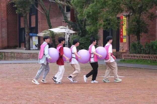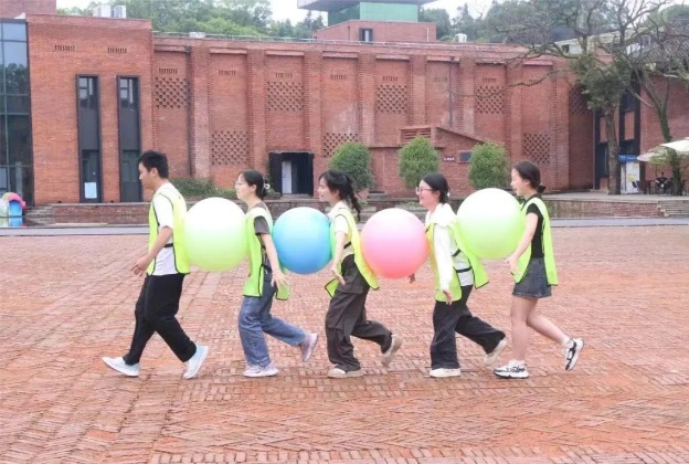 每个队伍的成员需要用身体夹住瑜伽球,由团队相互推动前进,绕过障碍,回到起点。经过多次的尝试,4个队伍选择了不同的方案,有的队伍选择由位置最后的同学驱动全队,与此同时,有的队伍选择了两两配合,稳中求进。