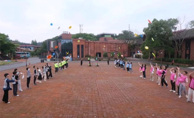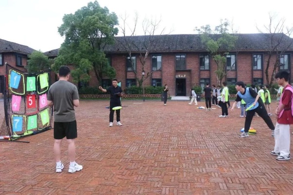 同学们拿到属于自己的飞盘,主持人一声令下,同学们将手中飞盘飞出,飞出了激情,疲惫和烦恼似乎也同时飞走。活动正式开始,四支队伍每名成员三次飞盘机会,网中1至9分,看谁更稳更准,最后比拼四队分数。