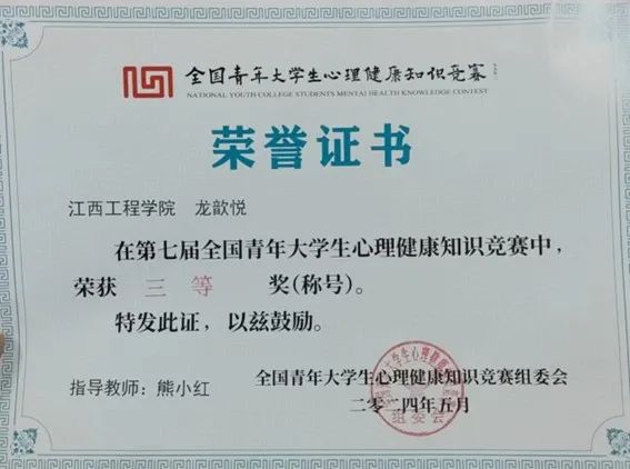 喜报——大数据与计算机学院龙歆悦在第七届全国青年老员工心理健康知识竞赛中荣获三等奖